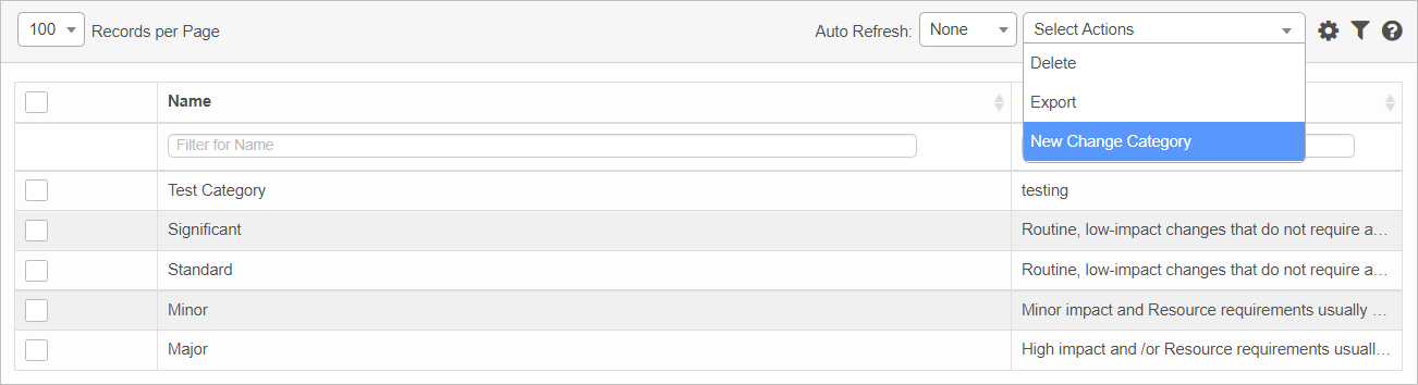 From the Select Actions drop-down list, choose New Change Category. The New Change Category window displays. |