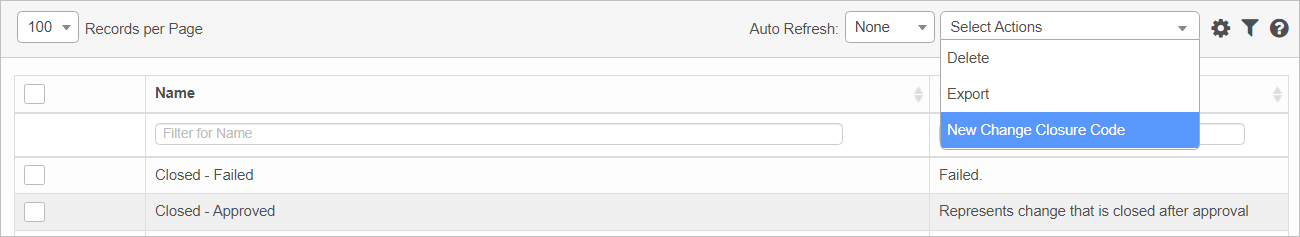 From the Select Actions drop-down list, choose New Change Closure Code. The New Change Closure Code window displays. |