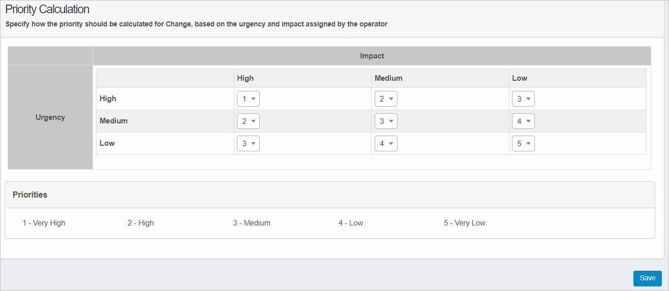 | 1. | In the main window, click Admin > Change Management > Change Priority Calculator. The Priority Calculation window displays. |
