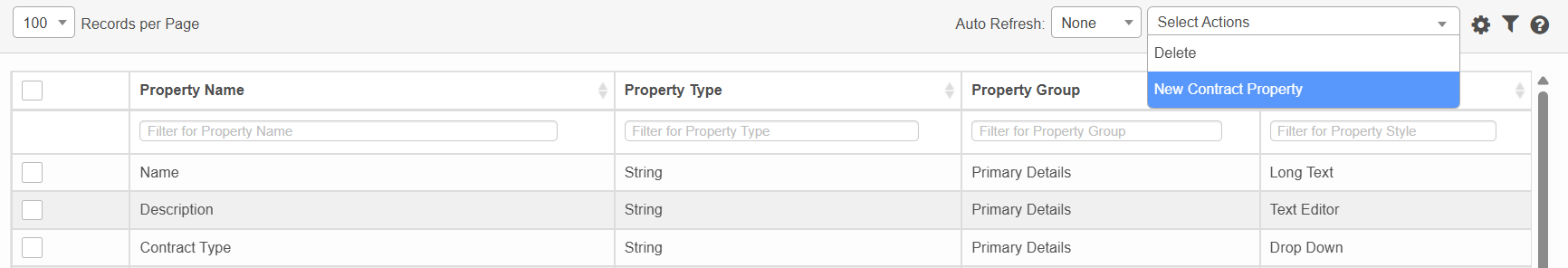 In the navigation pane, select Admin > Contract Management > Contract Properties. The Contract Property window displays.