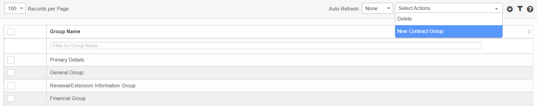 From the Select Actions drop-down list, choose New Contract Group. The New Contract Property Group window displays. |