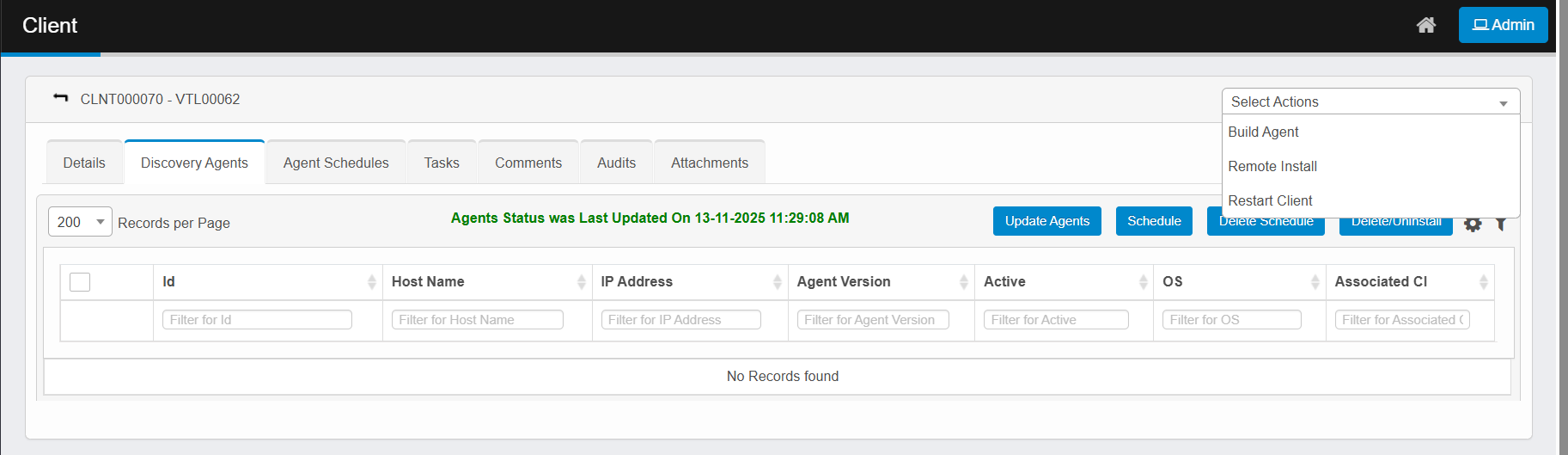 Select the client for which you want manage discovery agents. A new window displays with the Details tab displayed. |