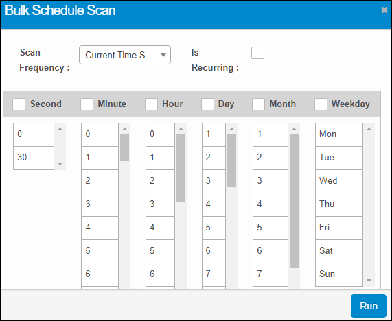 Select the Time (Second, Minute, Hour) and Date (Day, Month, Weekday) for the scan to occur. |