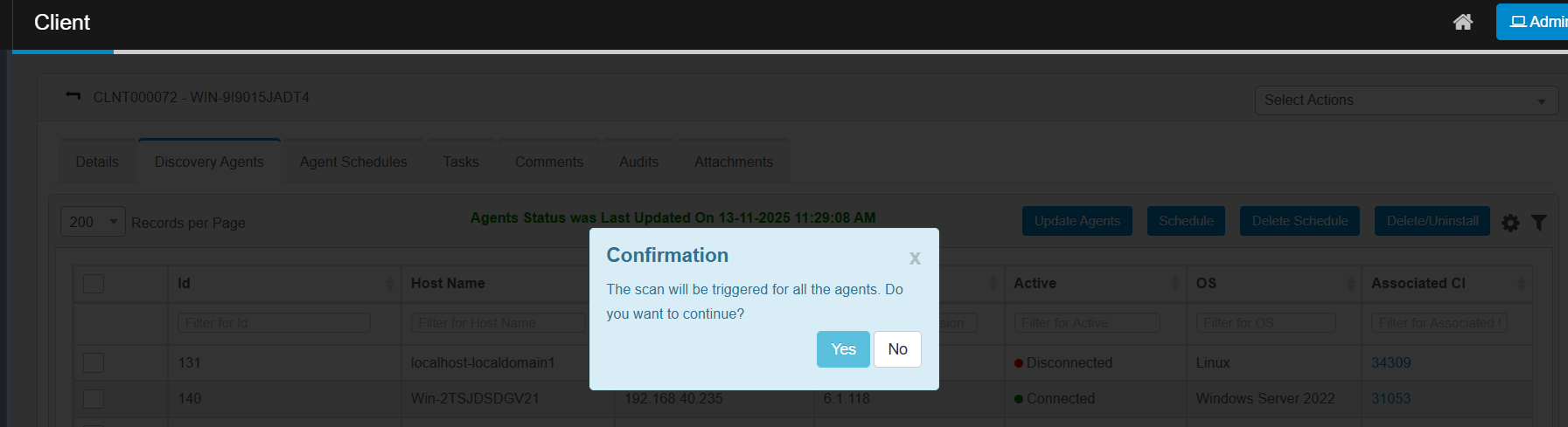 This action opens a configuration window that allows you to scan discovery agents.