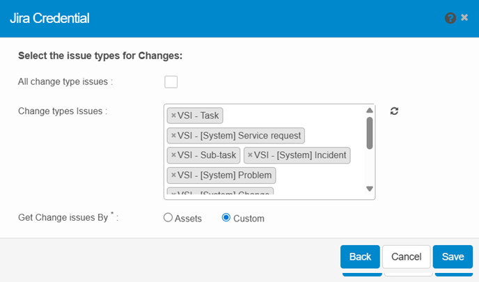 Select Change types issues, choose how to retrieve change issues by clicking Assets or Custom (link Asset Name to Jira changes or map properties), and click Save. |