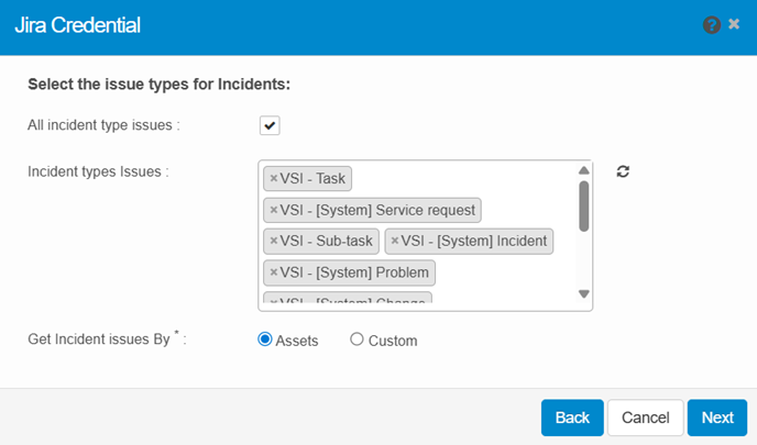 Select Incident type issues, choose how to retrieve issues by clicking Assets or Custom (link Asset Name to Jira incidents or map properties), and click Next. |
