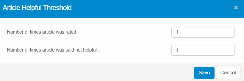 | 1. | In the main window, click Admin > Knowledge Management > Article Helpful Threshold. The Article Helpful Threshold dialog box displays. |