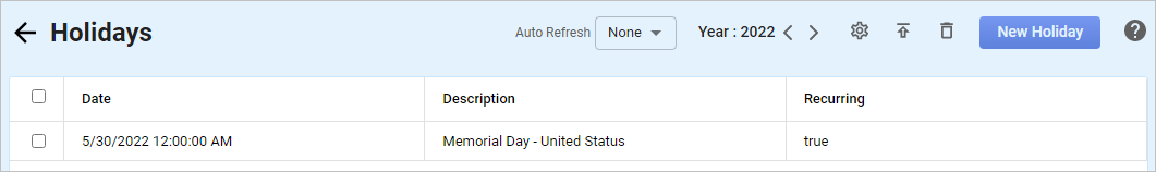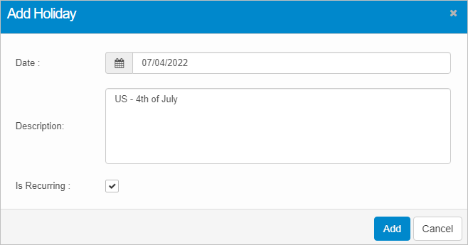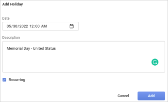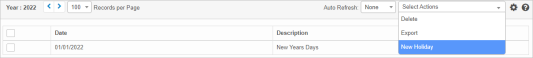 From the Select Actions drop-down list, choose New Holiday. The Add Holiday dialog box displays. |