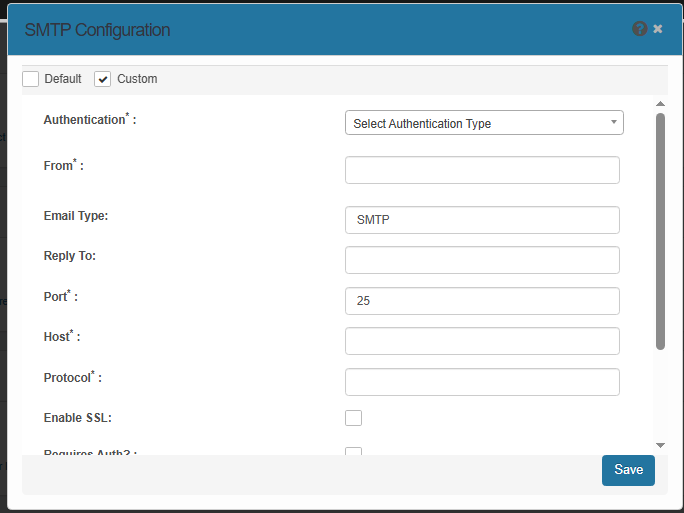 | 1. | While viewing the SMTP Configuration dialog box, click Custom.![]() |