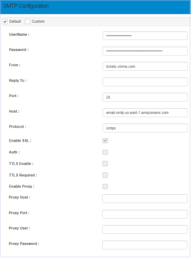 | 1. | In the main window, click Admin > Others > SMTP Configuration. The STMP Configuration dialog box displays. The Default option is selected, be default. It uses the Virima configured SMTP server credentials. |