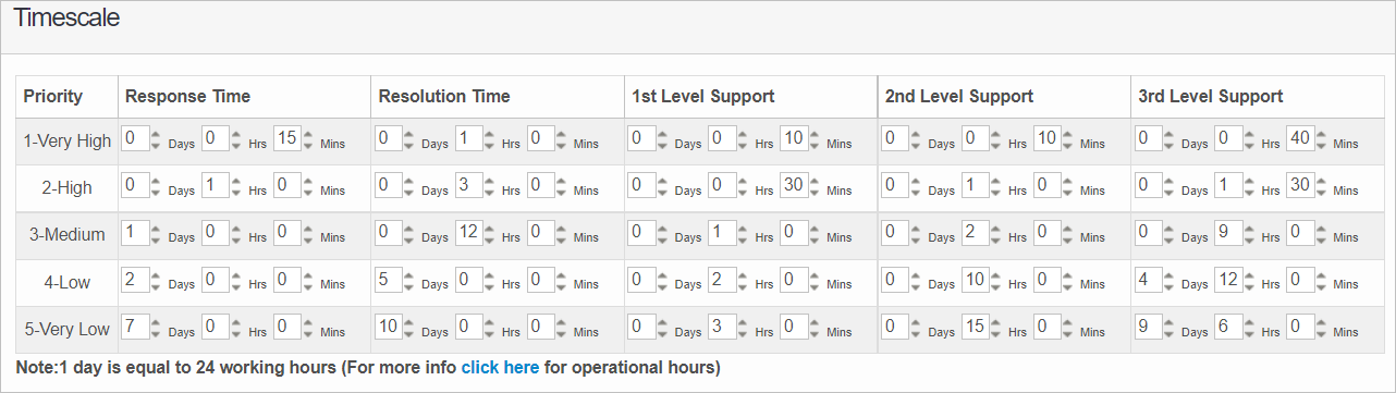 1 day is equal to 24 working hours. (For more info, see Operational Hours.)