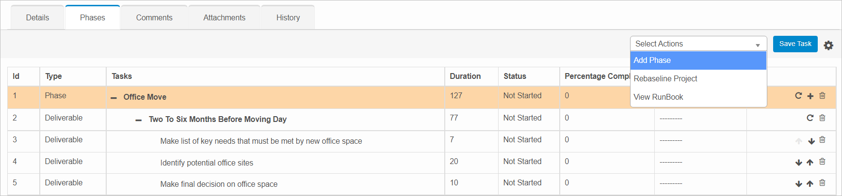 | A phase and its associated tasks (even if the tasks status is Not Started) cannot be Deleted/Edited once the phase is Completed or Suspended. An alert message displays if this is the case. |