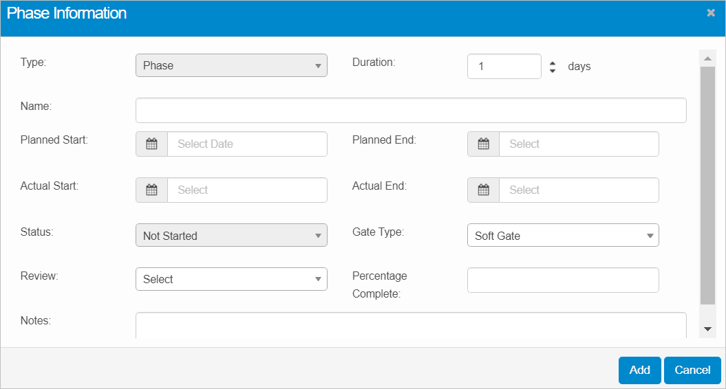 | 3. | From the Select Actions drop-down list, choose Add Phase. The Phase Information dialog box displays. |