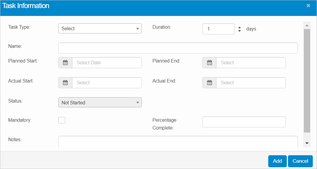 Indicates the number of days by which the task must be completed. Duration is based on the organization working days. |