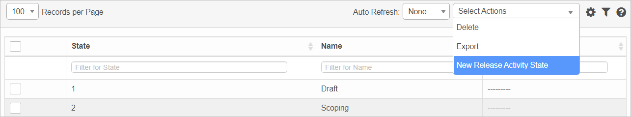 From the Select Actions drop-down list, choose New Release Activity State. The New Release Activity State window displays. |