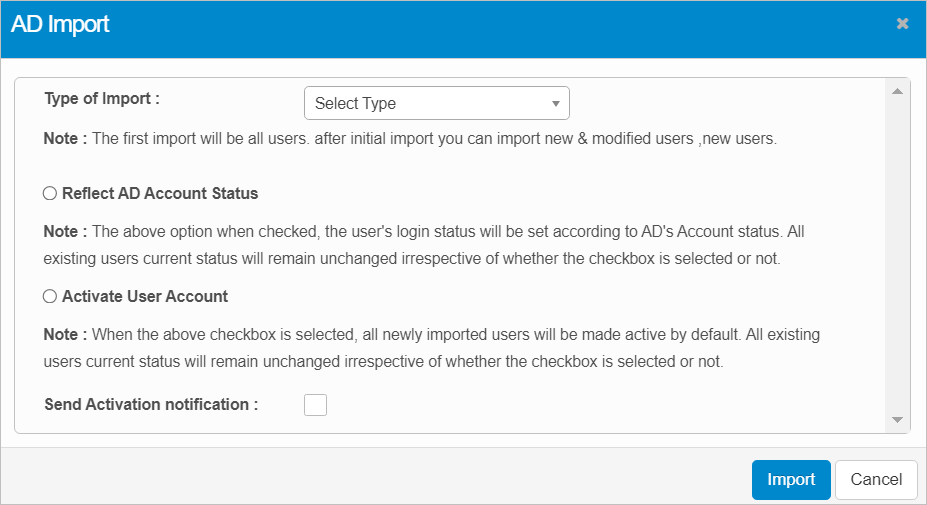 In the Type of Import field, click the drop-down list and select the type of import, such as All Users. |