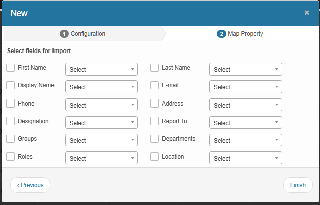 In the Map Property tab, select fields for import (for example: First Name, Last Name, Email, Phone, Roles, Groups). |