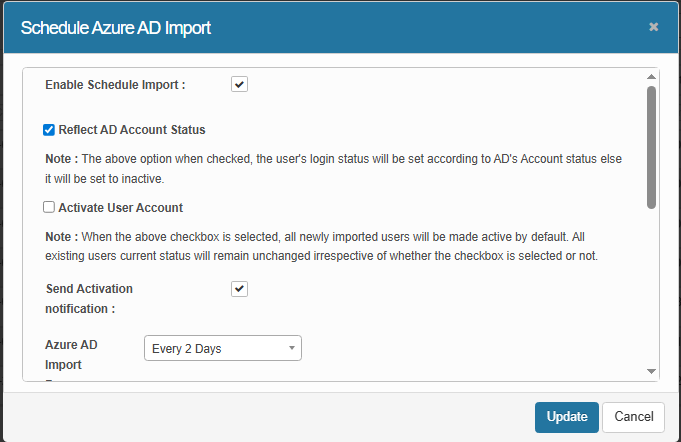 From the Azure AD Import Frequency drop-down list and select the applicable frequency. If necessary, modify the Every Day, Every 2 Days, Every Week, etc. |