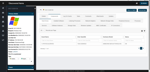 The Components tab offers a detailed view of the individual elements that comprise a discovered asset. It breaks down the asset into its technical components, providing insight into the system’s hardware and software configuration. This detail is crucial for effective IT asset management, troubleshooting, and audit readiness.