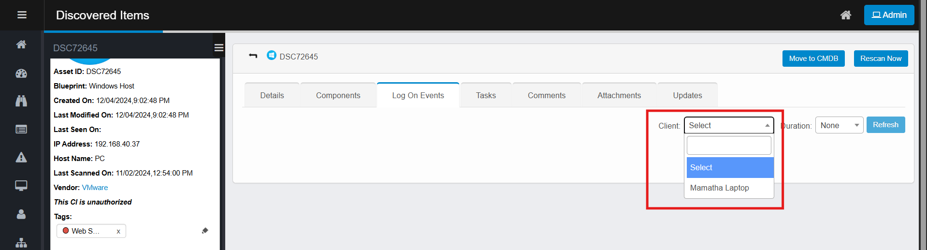 The Log On Events tab is part of the detailed view of a discovered asset, tracking user login activity on the selected machine. This tab reveals who accessed the system, when, and by what method or protocol. It is useful for auditing user behavior and detecting unauthorized access attempts.