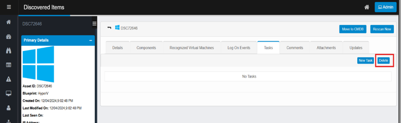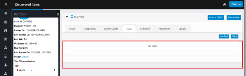 The Tasks tab in the Discovered Item's detail view tracks and manages task assignments related to the specific asset. This feature enables IT teams to collaborate by assigning, documenting, and monitoring tasks linked to a particular configuration item (CI).