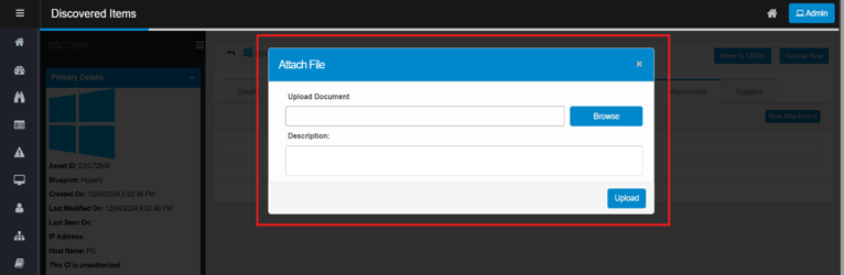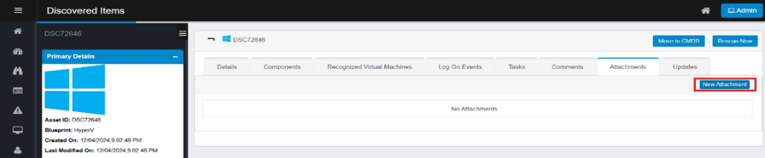 The Attachments tab allows users to upload and manage files linked to a discovered configuration item (CI). It serves as a centralized location for storing supporting documentation, screenshots, reports, logs, and other relevant files.