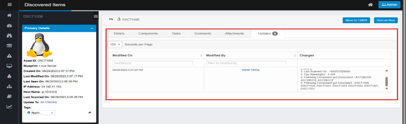 The Updates tab offers a chronological log of changes to a discovered Configuration Item (CI), serving as a critical tool for tracking modifications, updates, and administrative actions over time.