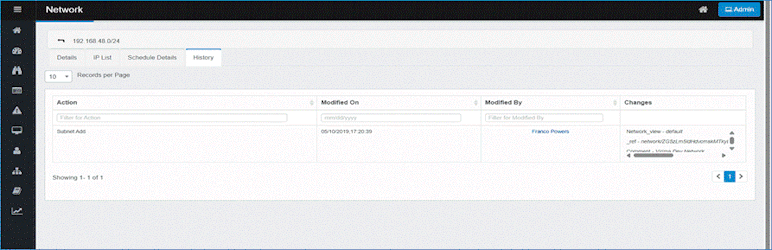The History Tab provides a record of all changes made to the network, including actions such as adding or modifying configurations.