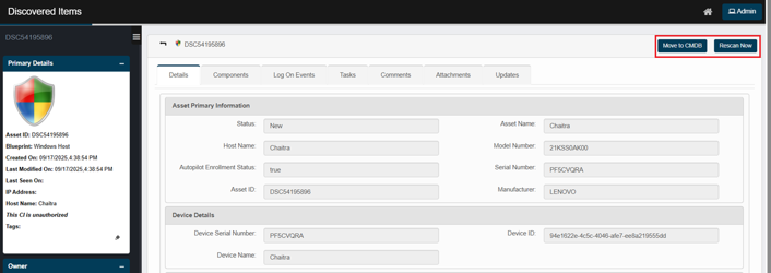 Rescan Now – Runs a targeted re-discovery for this single asset.