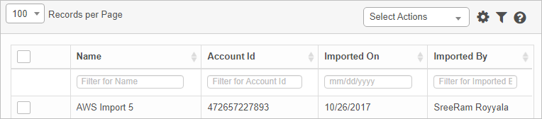 | 1. | In the navigation pane, select Discovery Scan > Import from AWS. The Import AWS window displays and contains a list of all currently imported records. |
