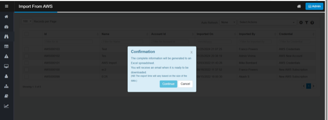 Exports data for the selected imported AWS record as an Excel spreadsheet and sends an email notification when the spreadsheet is ready for download.