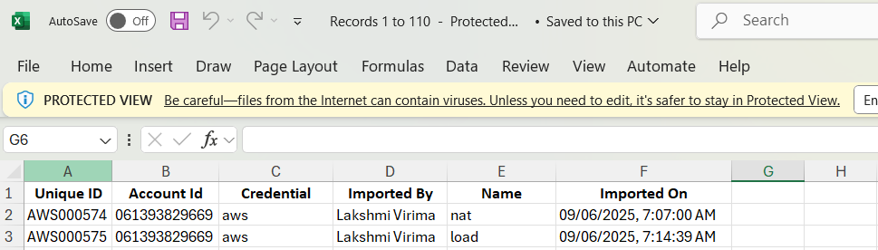 Account Id – The "Account Id" column displays the value entered for any credential type (Account Id, Organization Unit Id, or Root Id).