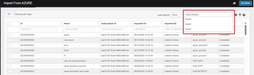 The file includes the grid columns (e.g., Unique ID, Subscription Id, Credential, Imported By, Name, and Imported On.) (Refer Exported Excel Column Details)