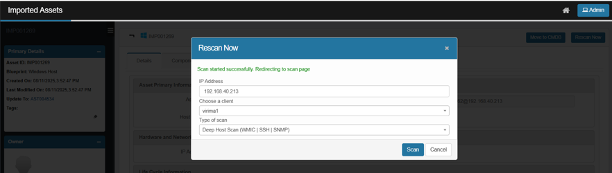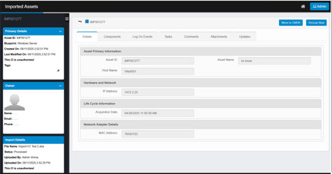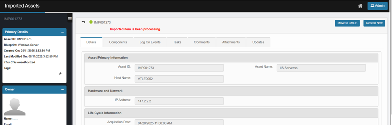 When viewing an imported asset in Virima, the page displays structured information across multiple sections, allowing administrators to review, validate, and take further actions such as moving the asset to the CMDB or rescanning.