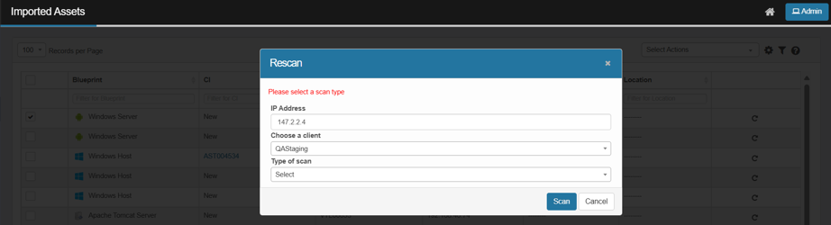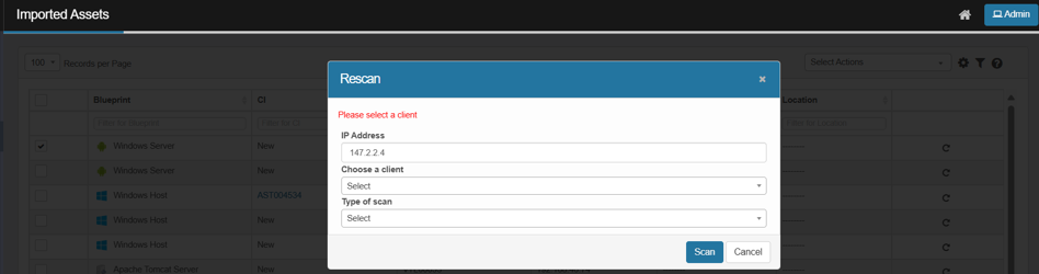 If the user selects a client but does not select a scan type and attempts to perform the scan operation, the system displays the error message: “Please select a scan type.”