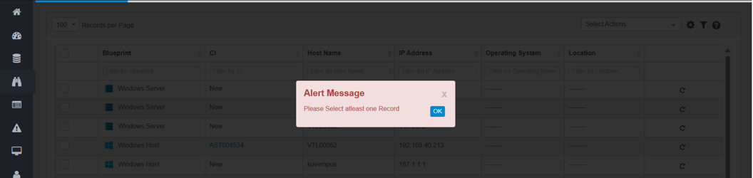If no record is selected, an alert message appears: "Please Select atleast one Record."