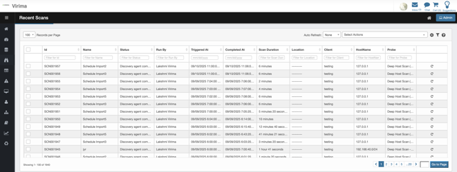The page displays the most recent scan runs (newest first) with the columns: Id, Name, Status, Run By, Triggered, Completed, Scan Duration, Location, Client, HostName, and Probe.