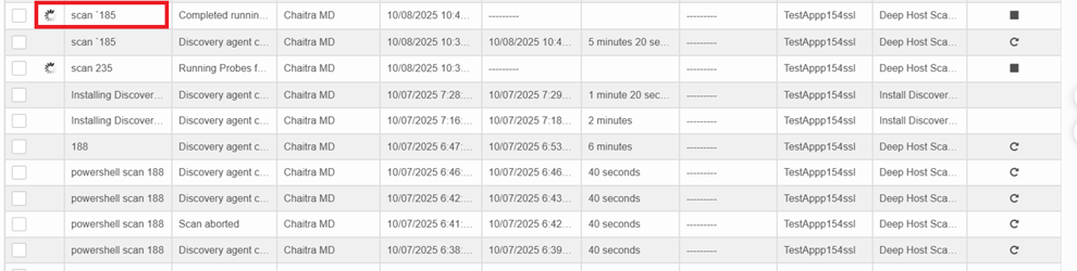 Rescan/Stop Scan: Allows users to manually reinitiate or repeat a scan for a specific entry. Each row corresponds to a discovery scan, providing a shortcut to run that scan again, regardless of previous success. This column also allows users to abort an ongoing scan and initiate a rescan.