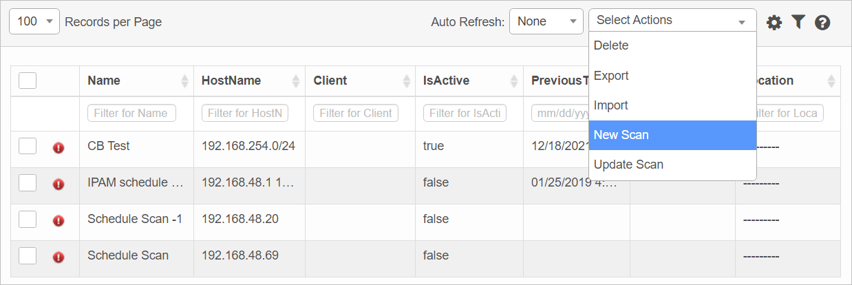 Specifies an IP Range to include in the scan. Click the icon to scan the entire subnet mask of the corresponding IP address. When adding an IP address, the IP range can be specified in various formats: 192.168.48.1 (Single IP)