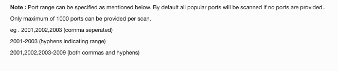 Port range can be specified as mentioned below, by default all popular ports will be scanned if no ports are provided.