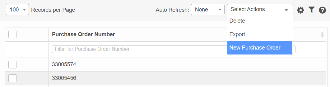 | 1. | From the Select Actions drop-down list, select New Purchase Order. The New Purchase Order window displays. |