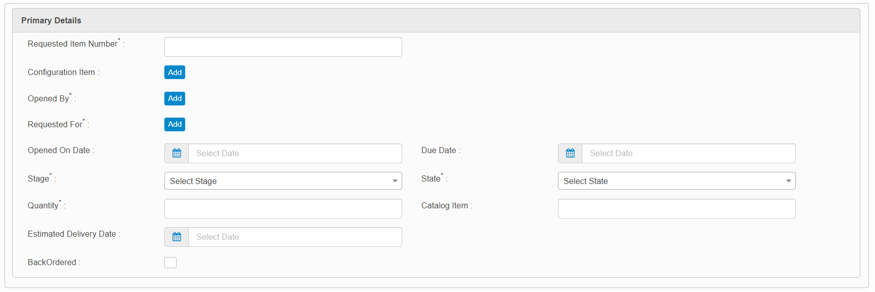 Stage. Click the drop-down list and select the stage for the request, such as Awaiting Delivery, Approved, etc.