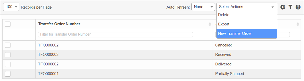 | 1. | From the Select Actions drop-down list, choose New Transfer Order. The Transfer Order window displays. |