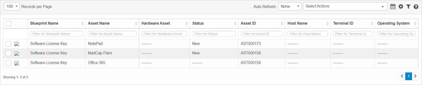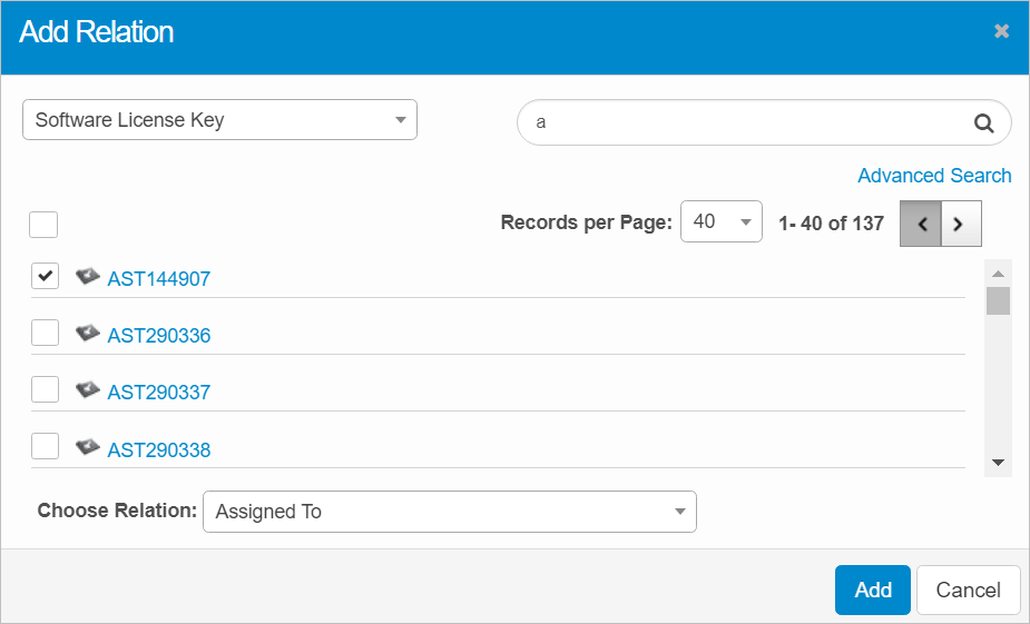 Used On. Lists the assets with the corresponding Software License key.
