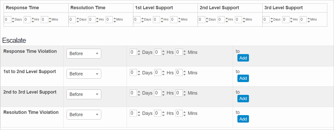 SLA. Configures response and resolution times for the Software License Key if marked as Incident, Requests, Changes, or Problems for resolution. Specify the Response and Resolution Time as well as the Support Levels. Then, configure the Escalate parameters.