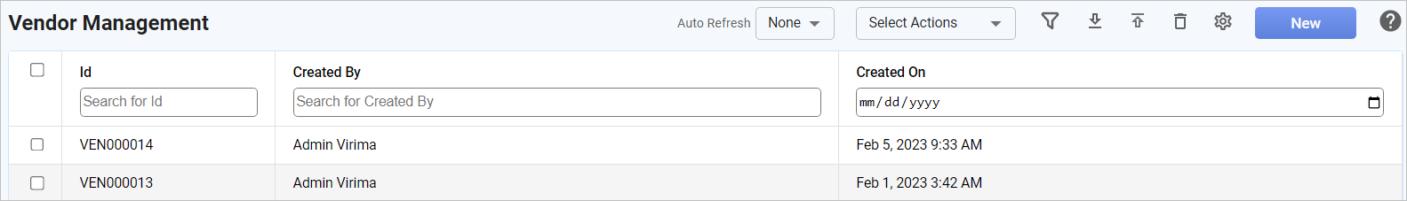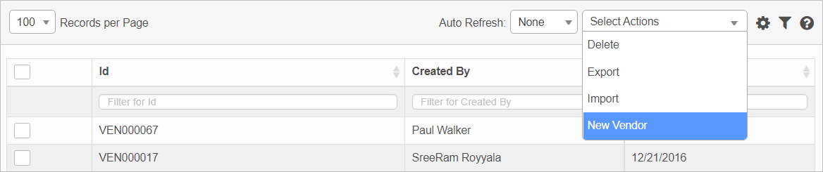 | 1. | From the Select Actions drop-down list, choose New Vendor. The New Vendor window displays. |