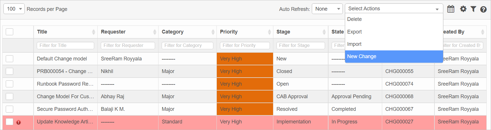 Roles with relevant access as per role access of Change and RFC can view, add, edit, approve, reject, resolve and close a change. |