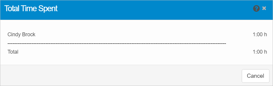 To generate a report for the time spent on this change, click Time Spent Report. A new window opens and displays the applicable time spent, sorted by User.