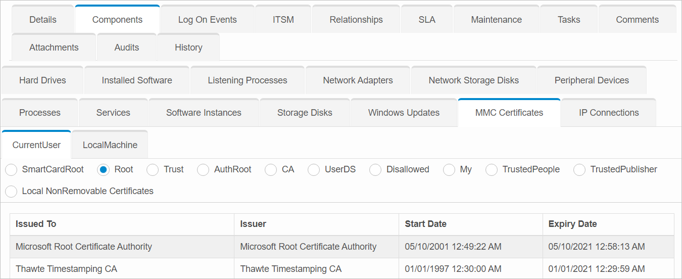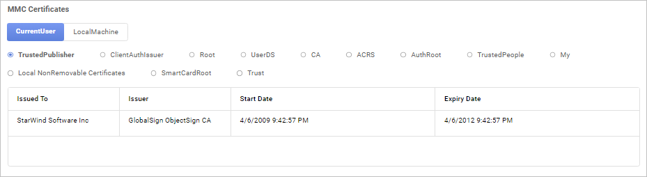| 6. | Click the radio button next to each item (such as Trusted Publisher, Client Auth Issuer, and so forth) to view the relevant details for the selected certificate. |