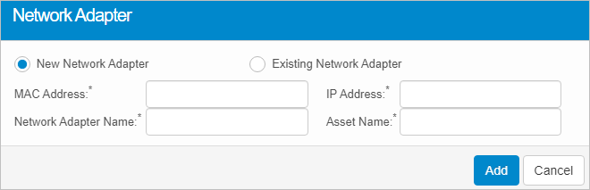 | 3. | Enter the MAC Address, Network Adapter Name, IP Address, and Asset Names. These are all required fields. |